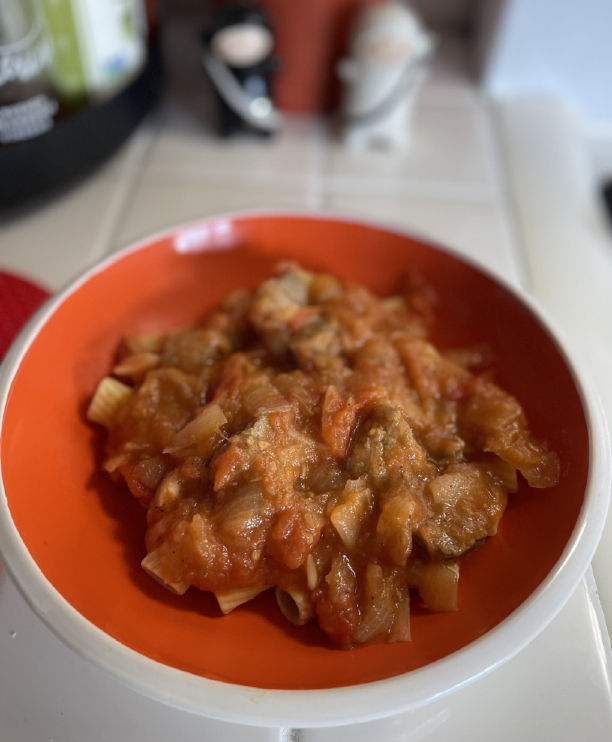 The linked recipe says it can be eaten with polenta or mashed potatoes or French fries. And it would be awesome with all of those but I had some leftover rigatoni that I needed to use up and I ate it over that. And I really enjoyed it! It would be great over rice too.